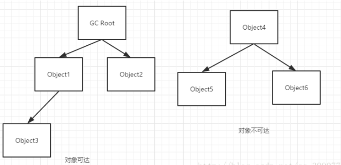 如图 Object1,Object2,Object3是对象可达的,Object4,Object5,Object6是不可达的