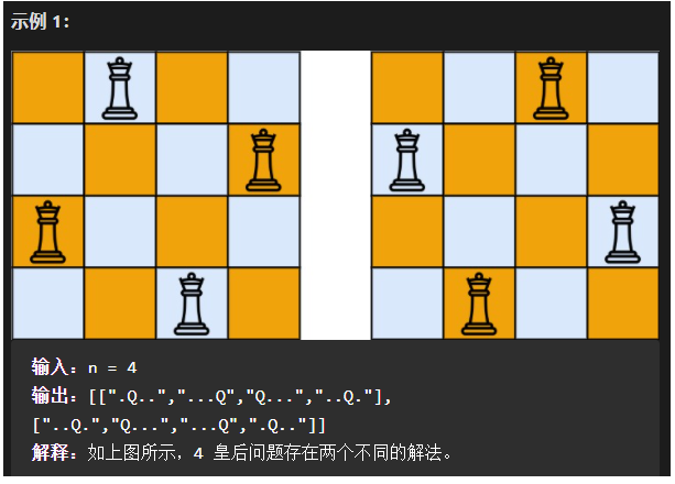每一种解法包含一个不同的 n 皇后问题 的棋子放置方案,该方案中 'Q' 和 '.' 分别代表了皇后和空位。