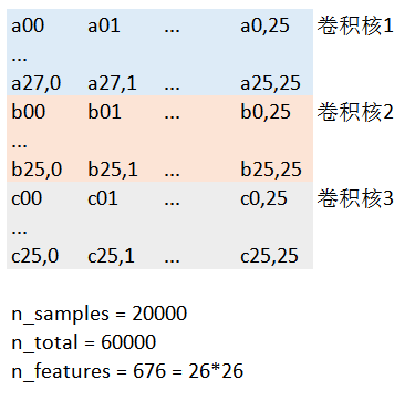 实验:对 MNIST 28*28 进行卷积核卷成 26*26,用 3 个卷积核 ,卷出 26*26*3,样本数量 20000 个。然后展平,用 BP 计算。展平的含义,26*26 = 676 个特征,样本量由原来的 20000 个变成 60000 个,将 3 个卷积核展平。