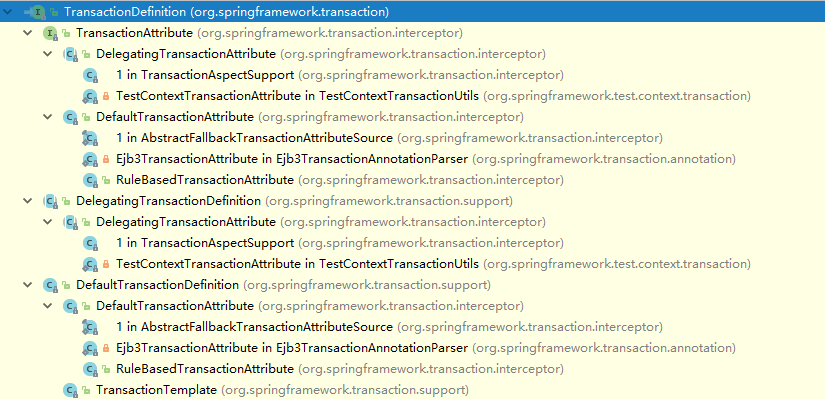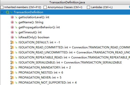 TransactionDefinition 用来描述事务的具体规则,该类中的方法如下: