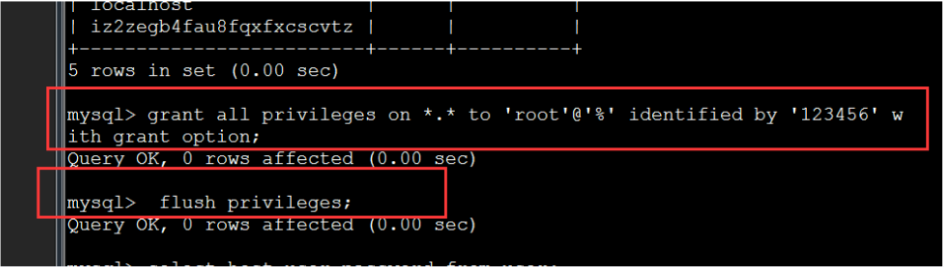 grant all privileges on *.* to 'root'@'%' identified by '123456' with grant option;