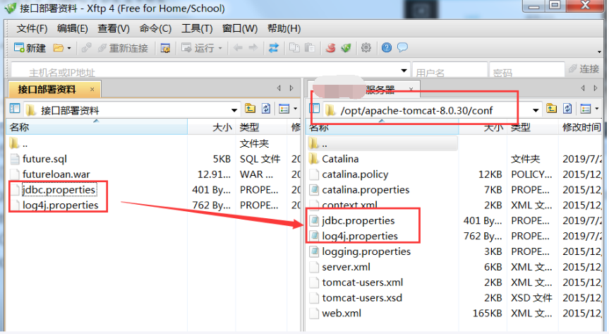 3、把 jdbc.properties(数据库信息需要更改)、log4j.properties(老哥否j,是日志配置文件,不用管),两个配置文件放到:/opt/apache-tomcat-8.0.30/conf
