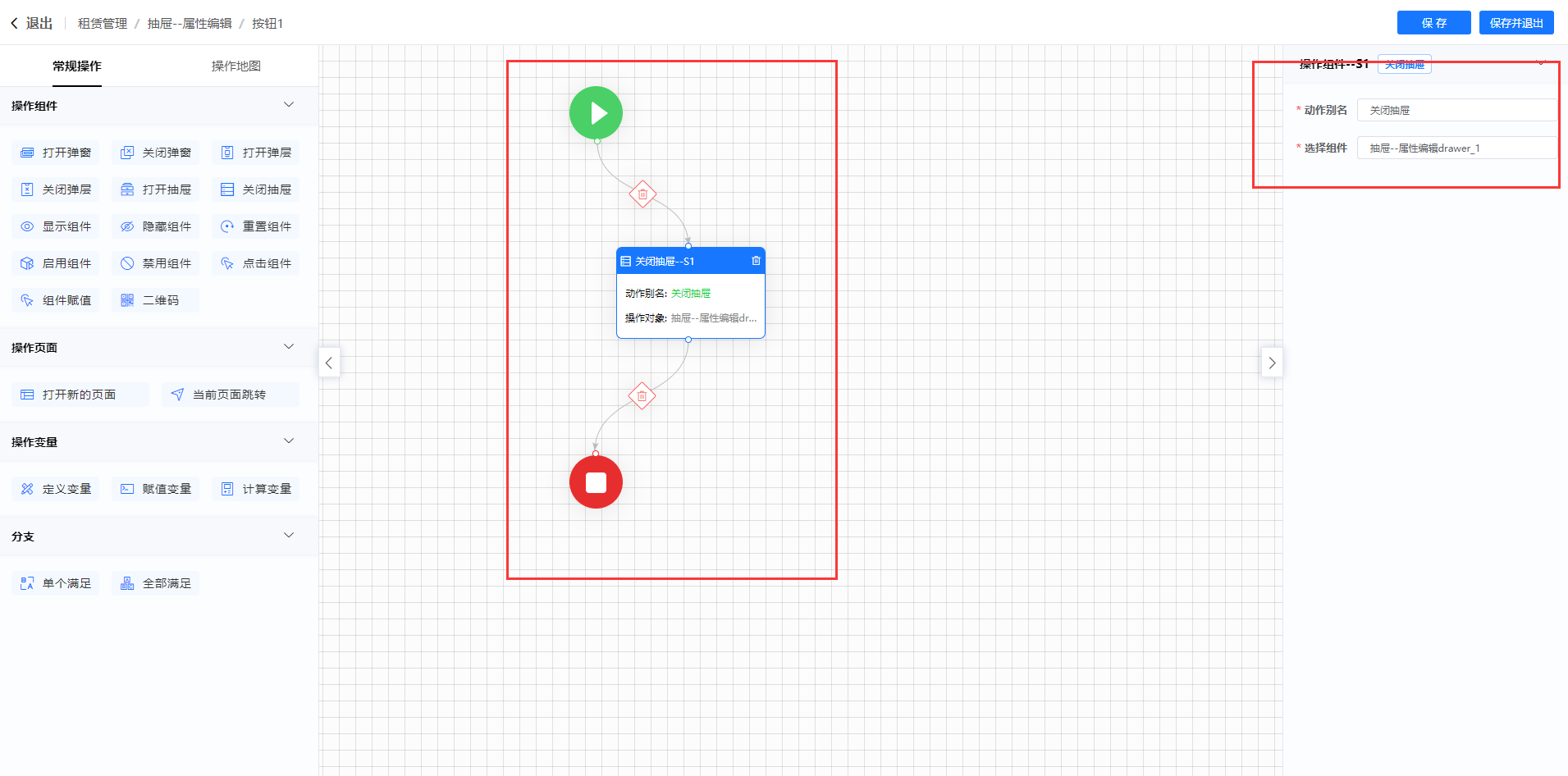 关闭抽屉的交互编排也是一样的操作步骤,对抽屉弹窗上的按钮进行关闭弹窗的交互编排,放置“关闭抽屉”卡片,连接开始端和结束端,在画布右侧选择需要关闭的抽屉组件,保存即可完成关闭抽屉的交互编排。