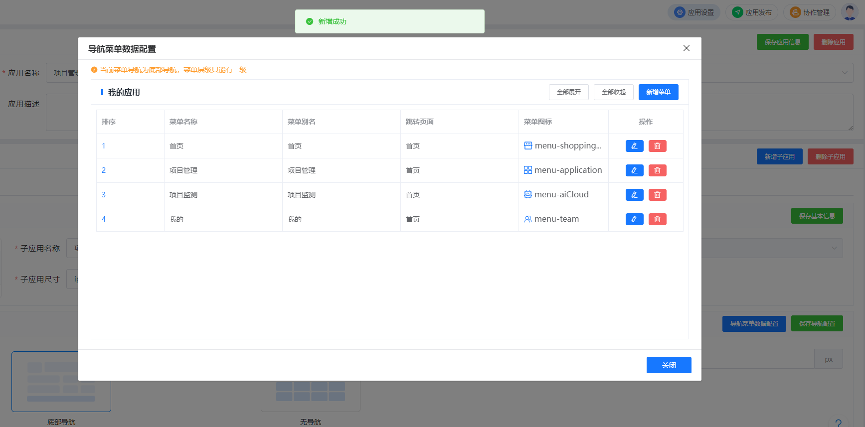 这里就是对刚才选择的底部导航进行配置,根据具体需求确定底部导航有几个字段,这里我按照模版中心的页面,也选择添加四个菜单字段。