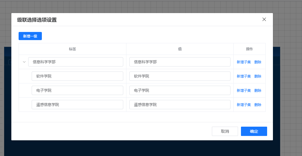 这里我只设置了两级,第一级表示学部,第二级表示学院,当然你也可以根据自己的需求设置更多的级别,我制作出来的效果是这样的。