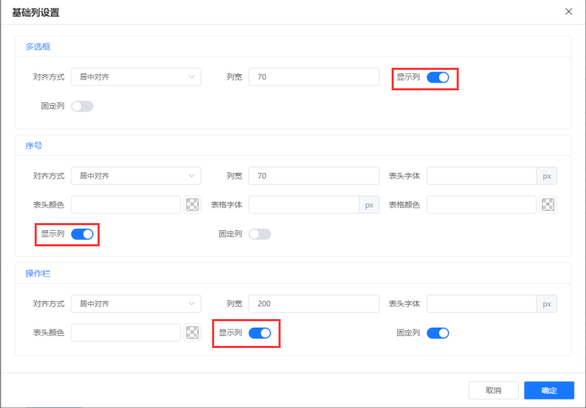 基础列设置包括多选框、序号和操作栏,根据自己需求确定是否需要这三个表格列,我这里是将显示列的开关全部打开: