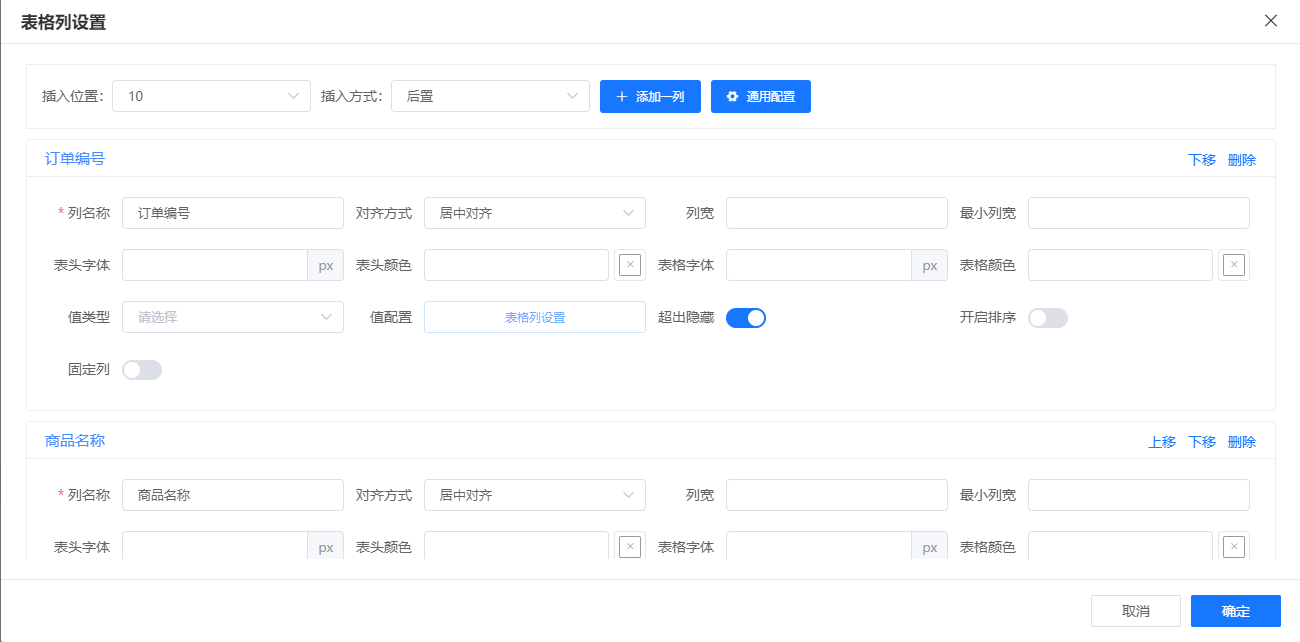 表格列设置就是根据自己的需求添加相应的字段,一般情况下你只需要设置‘列名称’、‘对齐方式’即可,其它设置根据自己的实际需求设置即可,当你的实际列多于系统的默认列,可选择‘插入位置’,‘插入方式’来添加表格列。