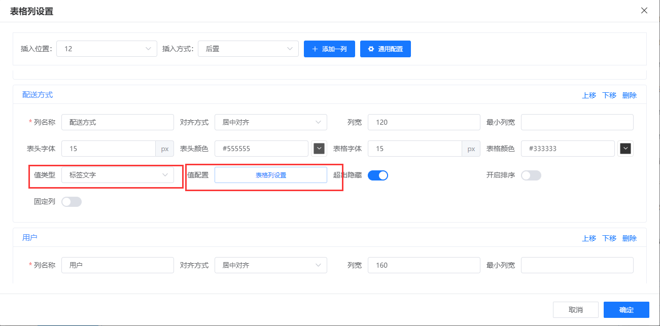 我们以图例中的‘配送方式’为例,在‘配送方式’表格列标签设置时,首先要选择‘值类型’为‘标签文字’,此时右侧‘值配置’才有效。