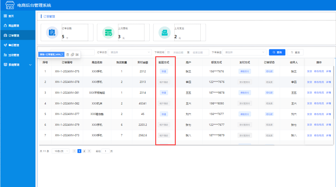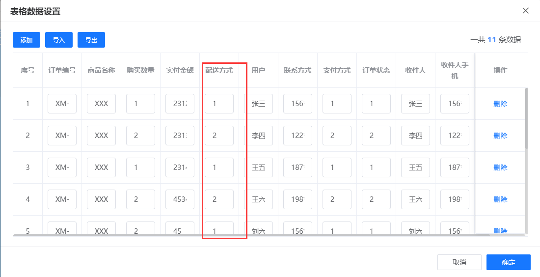 表格数据设置相比较而言最简单,你可以‘导出’表格模板,在本地输入相应的值,在一键‘导入’即可,这是最方便的;也可以在线填写数值,只是稍微耗费时间一些。不过我这里要强调一点,刚才我们在表格列设置中将部分字段设置为标签文字,那我们在表格数据设置中的对应字段下填入对应的过滤值,我们以‘配送方式’为例,如图所示:
