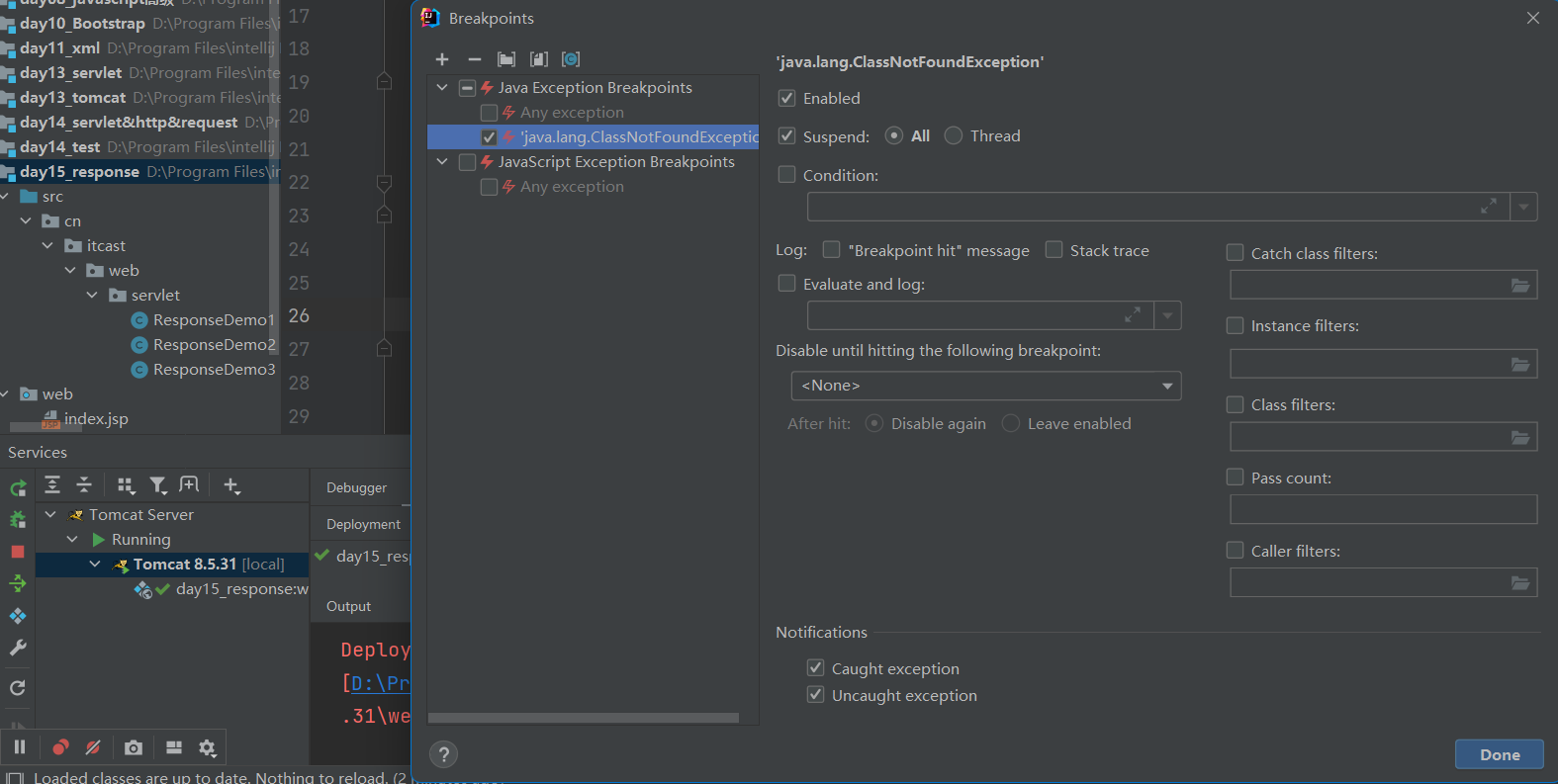 使用debug模式tomcat无法连接:原因是编译器自动设置了断点。