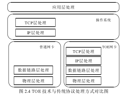 TOE技术的思想是利用硬件的速度优势来解决软件的性能瓶颈[17]。将TCP/IP协议栈的全部或者部分工作卸载到硬件上去执行,通过将协议处理过程卸载到专用的硬件网卡上,利用硬件执行速度快等特性,减轻了CPU和I/O系统的负担。通过软件协议栈的硬件化方式解放了CPU,提高了系统的性能。TOE技术与传统TCP/IP协议处理方式对比如图2.4所示。