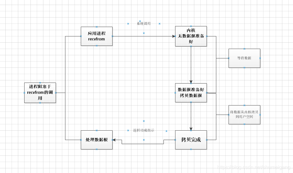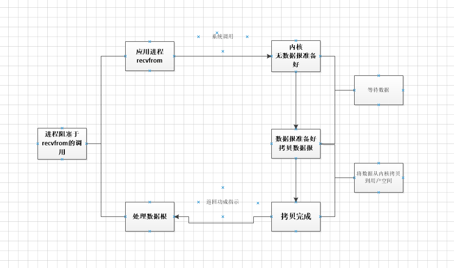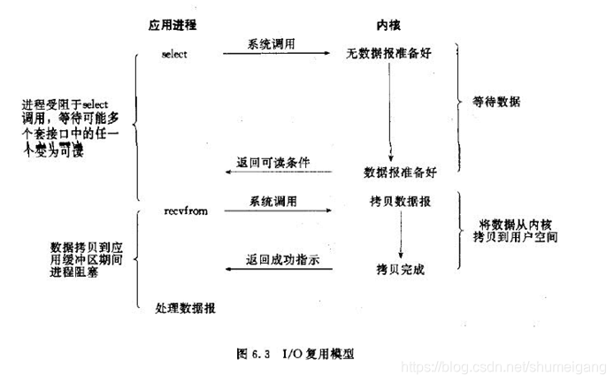 注意:也就是说,进程从调用recvfrom开始到返回的整个时段都是阻塞的(上述1.1两个阶段都是阻塞),recvfrom成功返回后,应用进程才开始处理数据报。