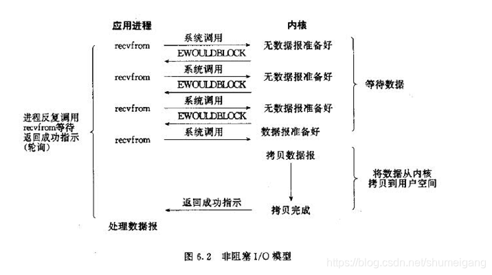 注意:值得注意的一点是,当第一阶段数据准备完成后,进入第二阶段,内核向内存的复制。这一阶段仍然是阻塞的,这对于后续理解非阻塞与同步的关系十分重要。
