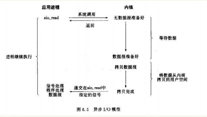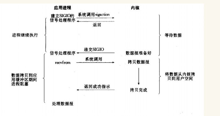 首先启动信号驱动I/O的socket,然后安装一个使用sigaction系统调用的signal handler,这个系统调用是立即返回的,并且返回后还继续执行,它是非阻塞的,当数据报准备好时,就会生成SIGIO信号,我们可以调用recvfrom从signal handler读取数据,并且告诉主循环数据已经准备好被获取了;或者我们可以通知主循环,让它自己读取数据。