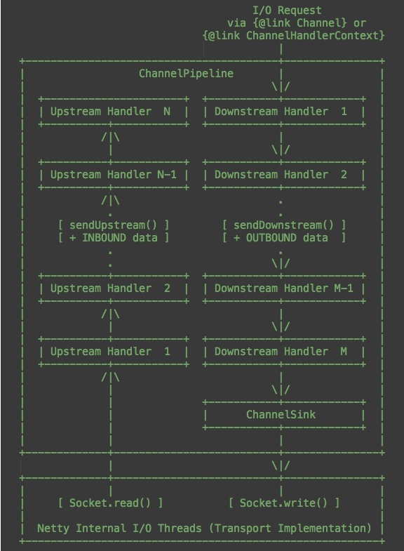 ChannelPipeline类是ChannelHandler实例对象的链表,用于处理或截获通道的接收和发送数据。它提供了一种高级的截取过滤模式(类似serverlet中的filter功能),让用户可以在ChannelPipeline中完全控制一个事件以及如何处理ChannelHandler,ChannelPipeline的交互。