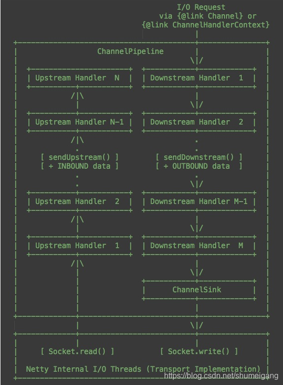(2)消息依次被HeadHandler,ChannelHandler1,ChannelHandler2... TailHandler拦截和处理,在这个过程中,任何ChannelHeadler 者可以中断当前的流程 ,结束消息的传递