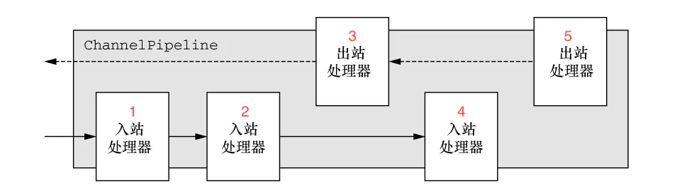ChannelPipeline将多个ChannelHandler链接在一起来让事件在其中传播处理。一个ChannelPipeline中可能不仅有入站处理器,还有出站处理器,入站处理器只会处理入站的事件,而出站处理器只会处理出站的数据,下面展示了一个同时具有入站处理器和出站处理器的ChannelPipeline: