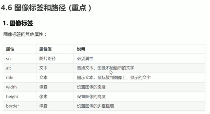 1、<img src = "图像文件名"/ title = " " alt = " " width = " " > 注意: src必须写
