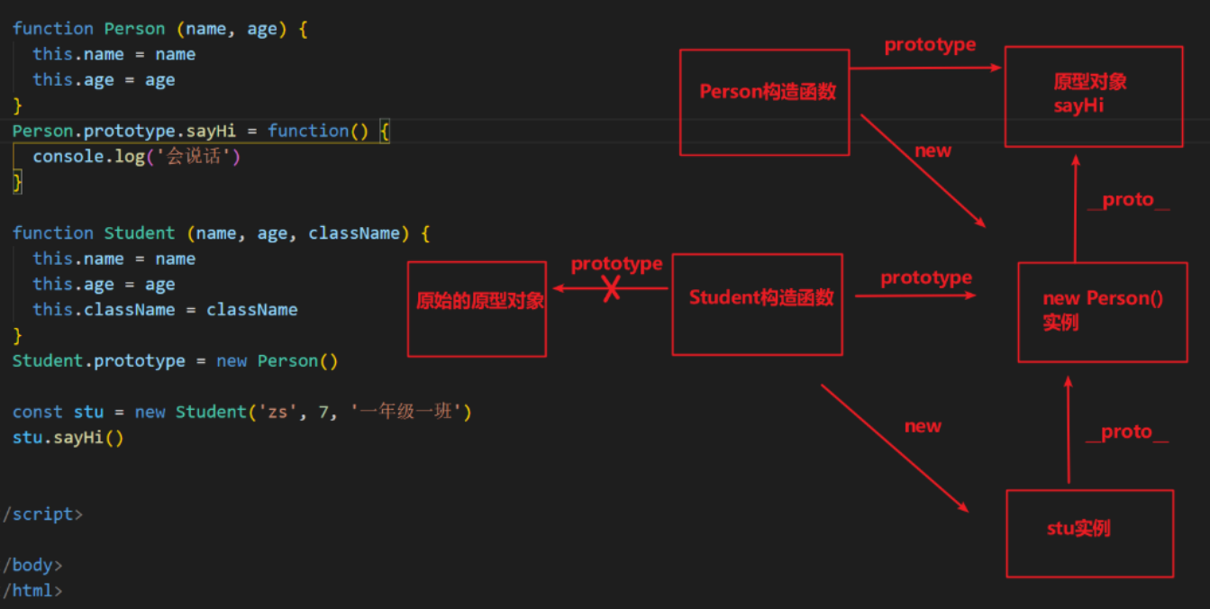 实现方案:将学生构造函数自己的原型对象的地址断开,指向人类实例对象,从而继承人类的原型对象的属性和方法