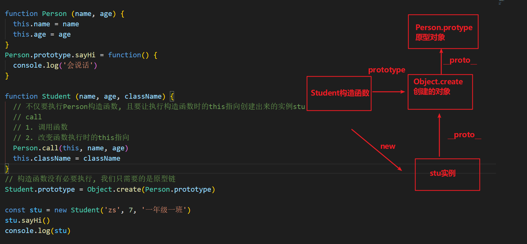 // 1. 定义Person构造函数 function Person (name, age) { this.name = name this.age = age } Person.prototype.say = function () { console.log('人类会说话') } // 2. 定义Student构造函数 function Student (name, age, className) { Person.call(this, name, age) this.className = className } // 3. 原型继承: 利用原型链, 继承于父级构造函数, 继承原型上的方法 // 语法: 子构造函数.prototype = new 父构造函数() // 构造函数没有必要执行,我们只需要的是原型链 Student.prototype = Object.create(Person.prototype) Student.prototype.study = function() { console.log('学生在学习') } let stu = new Student('张三', 18, '80期') stu.say() console.log(stu) // 总结: // Object.create() 以参数的对象, 作为新建对象的__proto__属性的值, 返回新建的对象