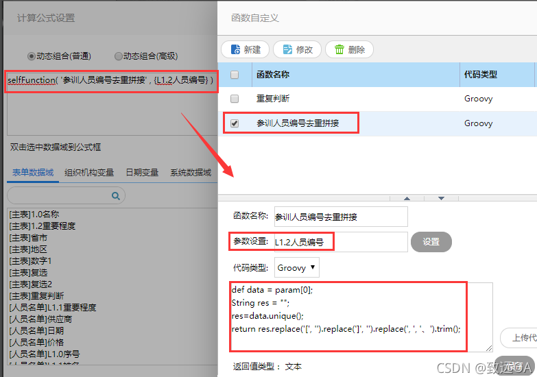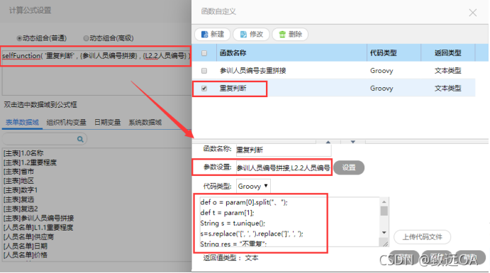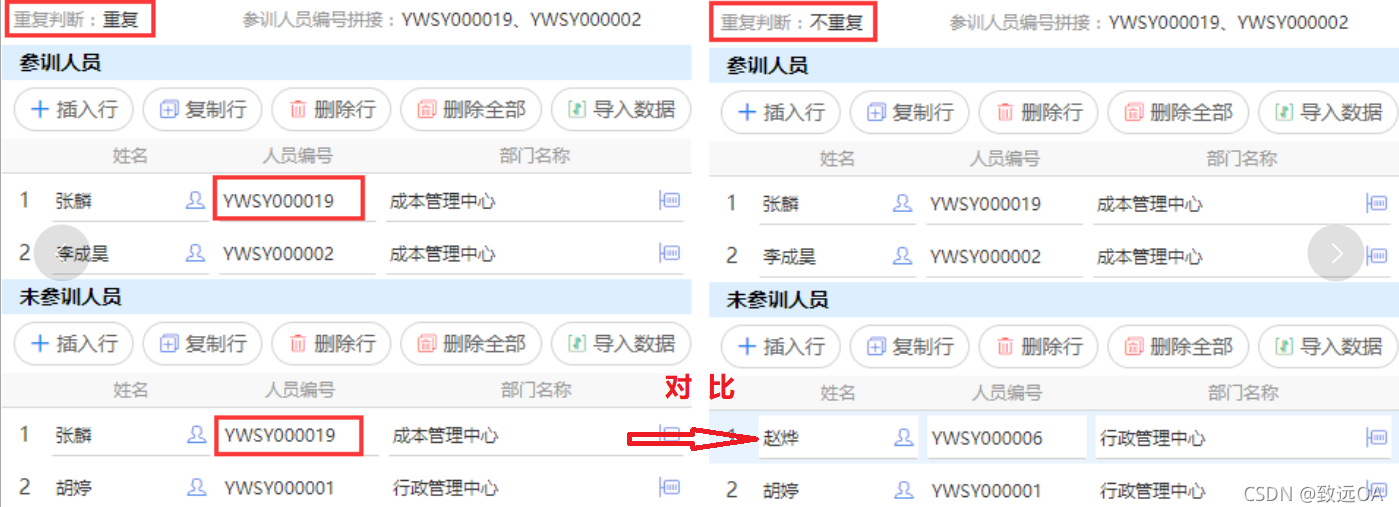 实现思路:将参与人员编号拼接后的值转换为数组,每一个值分别判断是否包含在未参训人员明细表中,若包含则返回“重复”,所有不包含则返回“不重复”。