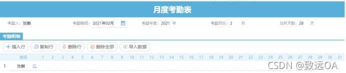 在月度考勤表中,主表有一个日期控件选择考勤期间,明细表包含姓名和1到31日,须根据当月的天数来控制29、30、31日的填写。
