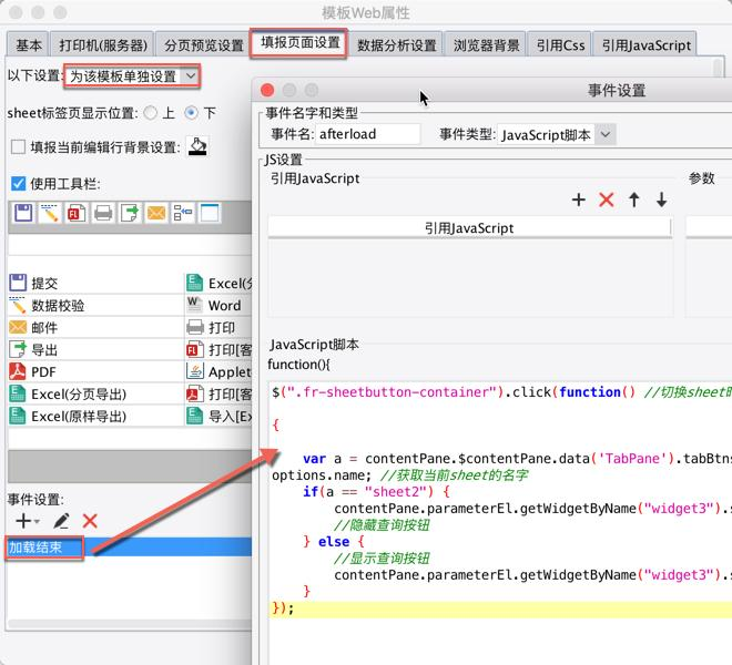 点击模板>模板web属性>填报页面设置(根据自己预览方式需要选择设置模式),选择为该模板单独设置,然后添加加载结束事件,如下图。注:(其中widget3为按钮名称)