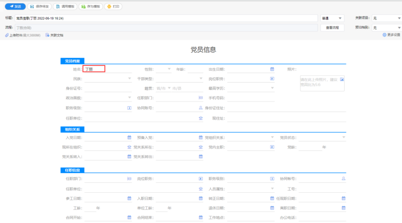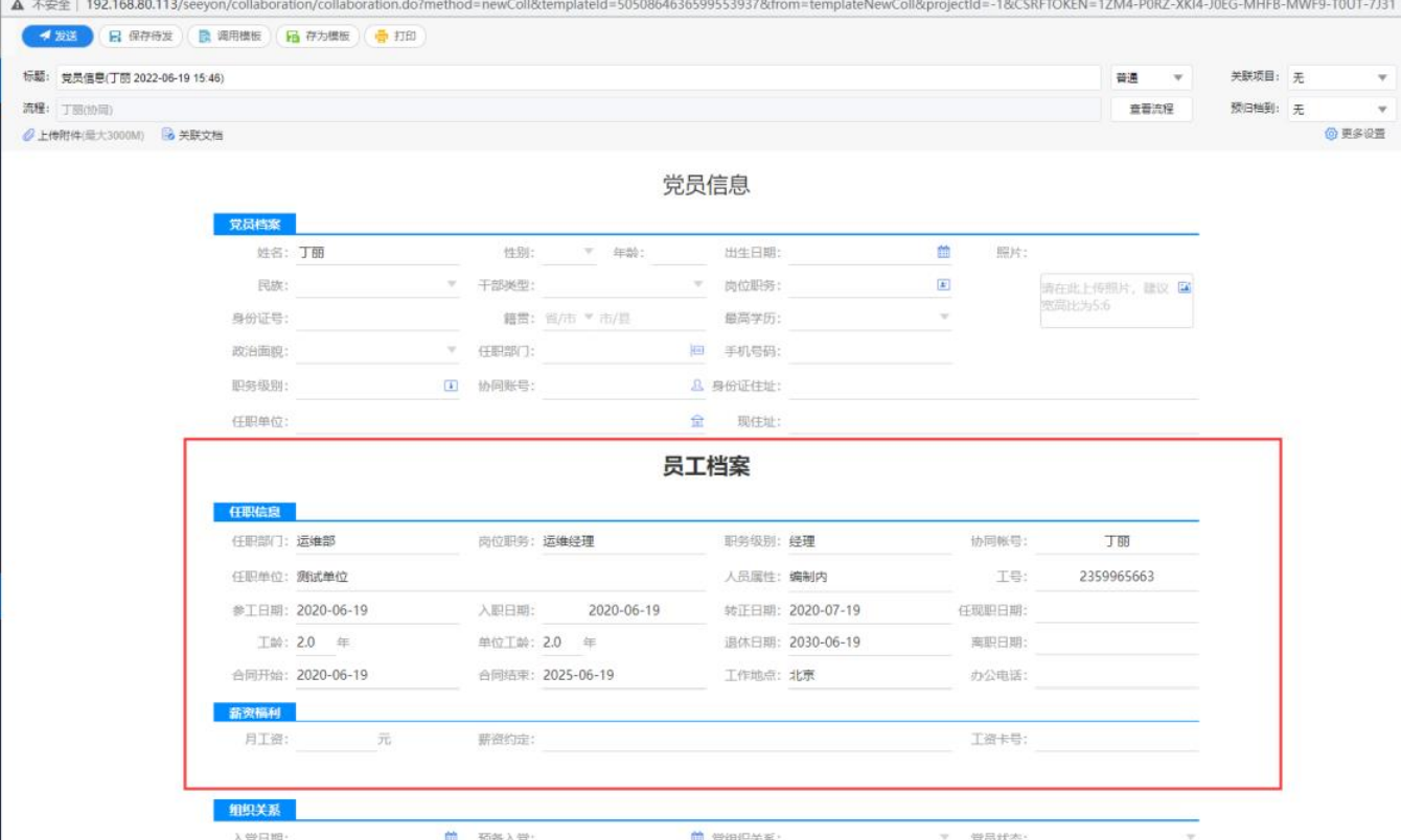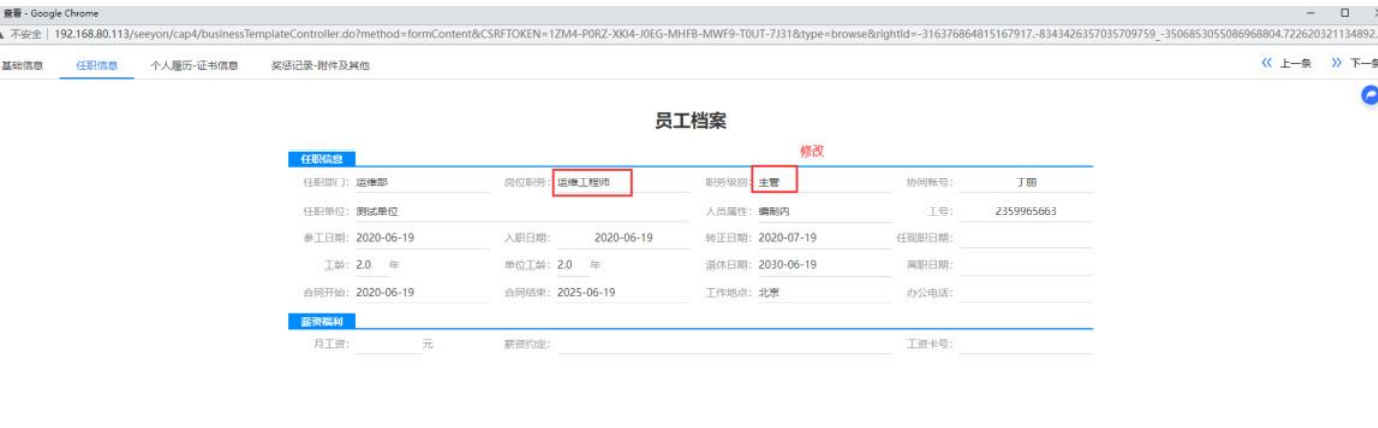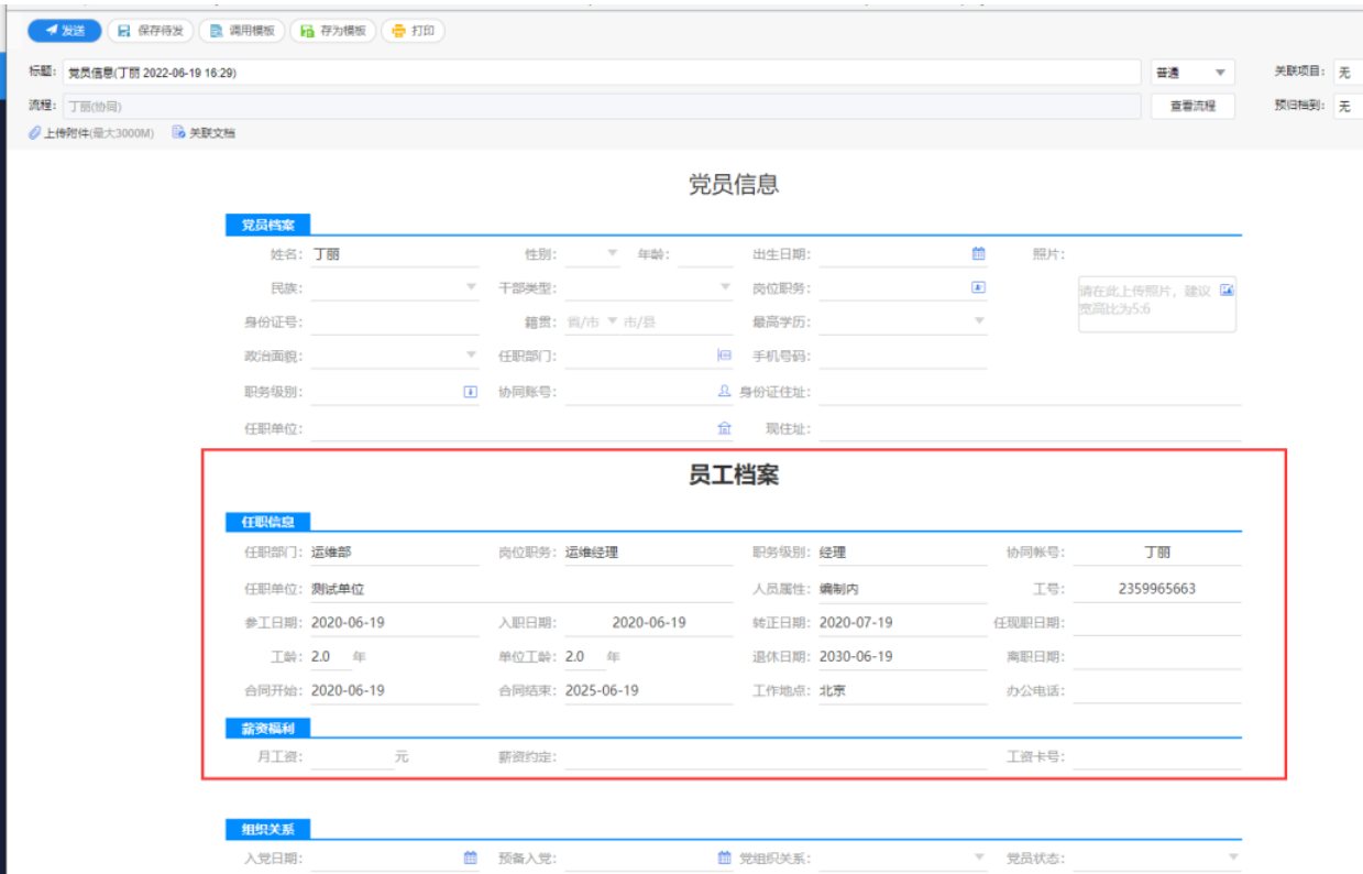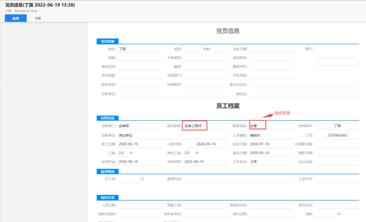 5、被引用视图表单字段内容修改后,引用表单字段内容在查看时即为改动状态下的 值,如【员工档案】中人员任职信息变动后,【党员信息】任职信息也同步变动,无需 再次保存(