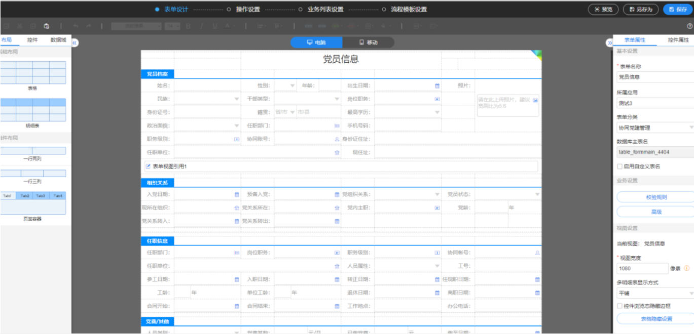 操作方法: 一、创建表单 1、应用设计师账号——应用定制平台——应用管理中心应用下分别创建流程表单“党 员信息表”、无流程表单“员工档案”如下: 有流程表单(需引入视图表单)