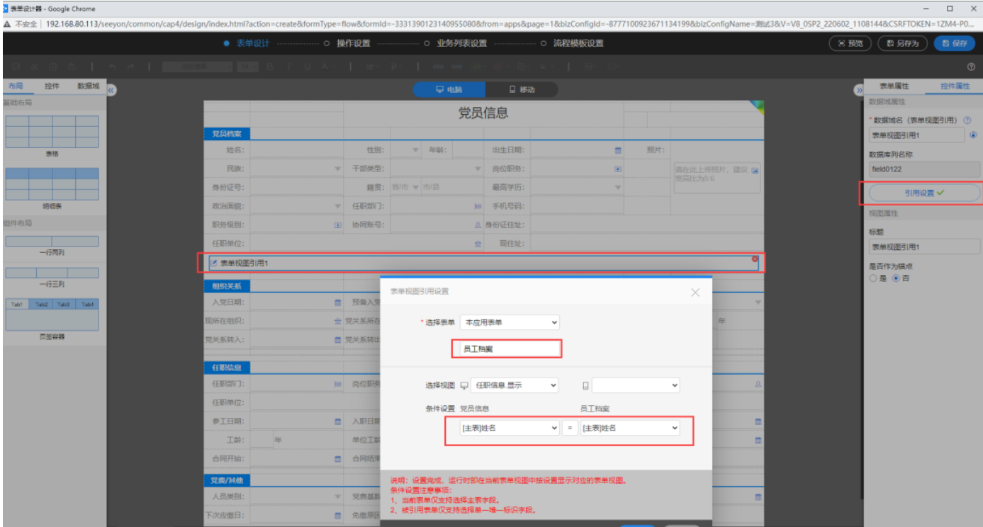 2、在表单设计界面增加自定义控件“表单视图引用”,并配置所引用的表单,本案例 配置员工档案表(注:表单制作时,需要布局好表单,引入的视图会显示在表单视图引 用控件位置,顺移表单页面内容位置)