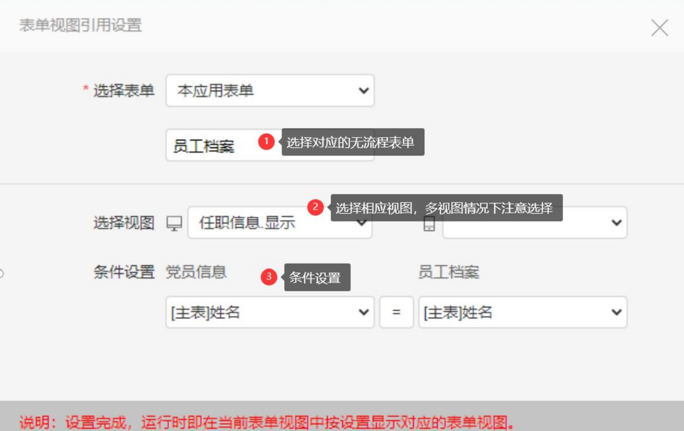 (1)选择对应的无流程表单,目前只支持选择无流程表单作为引用视图