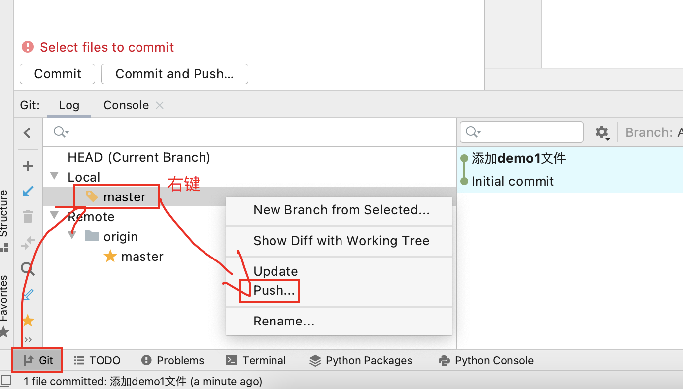 4,上传代码到远程仓库,点击左下角【Git】 ,在【Local】--【Master】--【右键】--【Push】