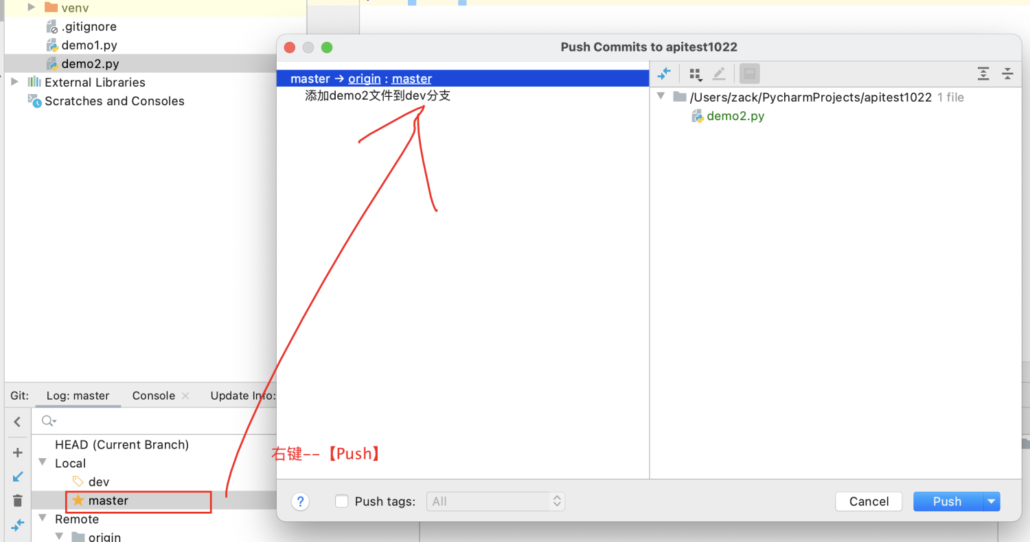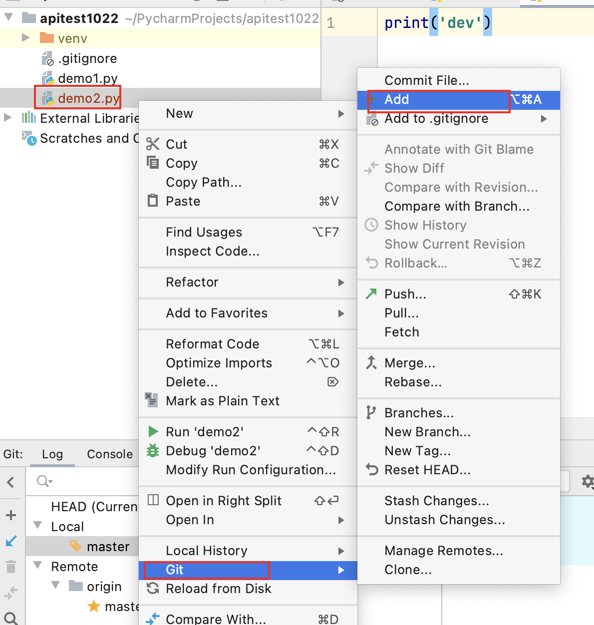 2,在demo2.py 文件上 【右键】--【git】--【add】