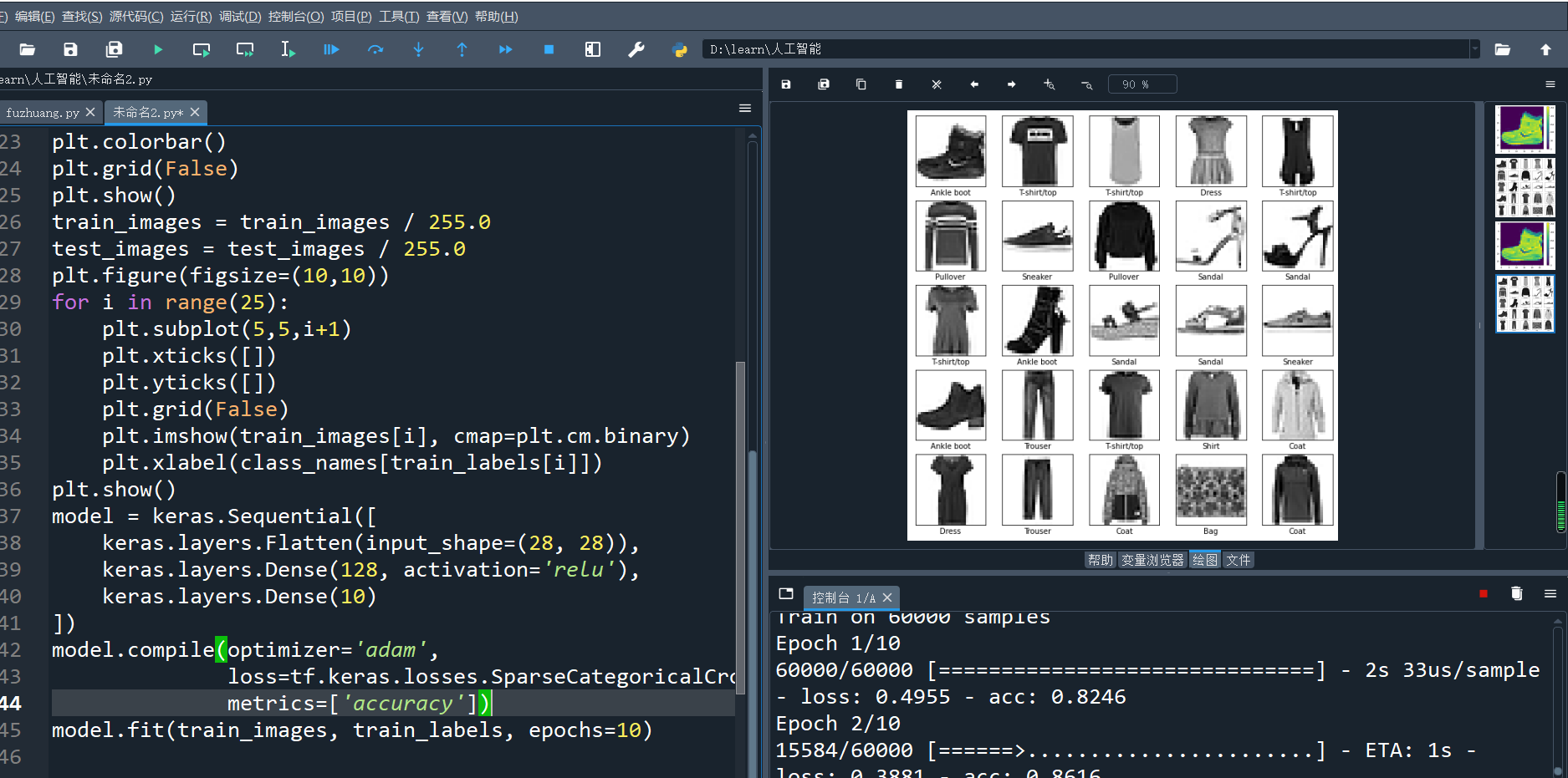 # -*- coding: utf-8 -*- """ Created on Mon Apr 25 00:23:34 2022 @author: 又双叒叕莹 """ import tensorflow as tf from tensorflow import keras import matplotlib.pyplot as plt fashion_mnist = keras.datasets.fashion_mnist (train_images, train_labels), (test_images, test_labels) = fashion_mnist.load_data() class_names = ['T-shirt/top', 'Trouser', 'Pullover', 'Dress', 'Coat', 'Sandal', 'Shirt', 'Sneaker', 'Bag', 'Ankle boot'] train_images.shape len(train_labels) train_labels test_images.shape len(test_labels) plt.figure() plt.imshow(train_images[0]) plt.colorbar() plt.grid(False) plt.show() train_images = train_images / 255.0 test_images = test_images / 255.0 plt.figure(figsize=(10,10)) for i in range(25): plt.subplot(5,5,i+1) plt.xticks([]) plt.yticks([]) plt.grid(False) plt.imshow(train_images[i], cmap=plt.cm.binary) plt.xlabel(class_names[train_labels[i]]) plt.show() model = keras.Sequential([ keras.layers.Flatten(input_shape=(28, 28)), keras.layers.Dense(128, activation='relu'), keras.layers.Dense(10) ]) model.compile(optimizer='adam', loss=tf.keras.losses.SparseCategoricalCrossentropy(from_logits=True), metrics=['accuracy']) model.fit(train_images, train_labels, epochs=10)