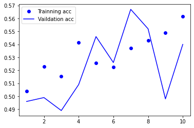 sgd, metrics=['accuracy']) history = model.fit(train_data, train_label, batch_size=20, epochs=10, validation_split=0.2, #把训练集中的五分之一作为验证集 shuffle=True) scores = model.evaluate(test_data,test_label,verbose=1) print(scores) model.save('model/vgg16dogcat.h5') acc = history.history['accuracy'] # 获取训练集准确性数据 val_acc = history.history['val_accuracy'] # 获取验证集准确性数据 loss = history.history['loss'] # 获取训练集错误值数据 val_loss = history.history['val_loss'] # 获取验证集错误值数据 epochs = range(1, len(acc) + 1) plt.plot(epochs, acc, 'bo', label='Trainning acc') # 以epochs为横坐标,以训练集准确性为纵坐标 plt.plot(epochs, val_acc, 'b', label='Vaildation acc') # 以epochs为横坐标,以验证集准确性为纵坐标 plt.legend() # 绘制图例,即标明图中的线段代表何种含义 plt.show()