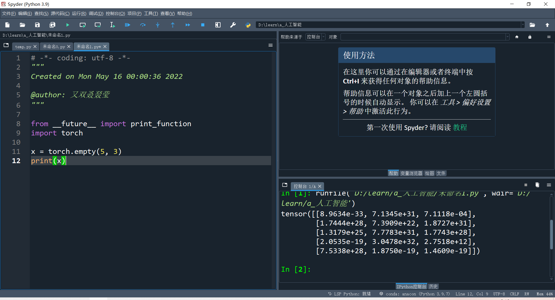 # -*- coding: utf-8 -*- """ Created on Mon May 16 00:00:36 2022 @author: 又双叒叕莹 """ from __future__ import print_function import torch x = torch.empty(5, 3) print(x)