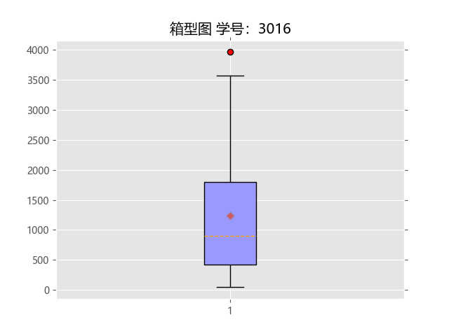 import pandas as pd file_path = r'D:\linshi\catering_fish_congee.xls' # r对路径进行转义,windows需要 raw_data = pd.read_excel(file_path, header=0) # header=0表示第一行是表头,就自动去除了 print(raw_data) import matplotlib.pyplot as plt import pandas as pd import numpy as np #import seaborn as import matplotlib.pyplot as plt # 设置中文和负号正常显示 plt.rcParams['font.sans-serif'] = 'Microsoft YaHei' plt.rcParams['axes.unicode_minus'] = False # 设置图形的显示风格 plt.style.use('ggplot') # 绘图:daily_Ionset_r_c1_predicted的箱线图 data= pd.read_excel(file_path, header=0,usecols=[1]) print(data) plt.boxplot(x = data, # 指定绘图数据 patch_artist=True, # 要求用自定义颜色填充盒形图,默认白色填充 showmeans=True, # 以点的形式显示均值 boxprops = {'color':'black','facecolor':'#9999ff'}, # 设置箱体属性,填充色和边框色 flierprops = {'marker':'o','markerfacecolor':'red','color':'black'}, # 设置异常值属性,点的形状、填充色和边框色 meanprops = {'marker':'D','markerfacecolor':'indianred'}, # 设置均值点的属性,点的形状、填充色 medianprops = {'linestyle':'--','color':'orange'}) # 设置中位数线的属性,线的类型和颜色 # 设置y轴的范围 #plt.ylim(0,3000) plt.title("箱型图 学号:3016") # 去除箱线图的上边框与右边框的刻度标签 plt.tick_params(top='off', right='off') # 保存图像 plt.savefig('./results_imgs.png', bbox_inches='tight') #保存的文件名,裁剪掉图表多余的空白区域 # 显示图形 plt.show()