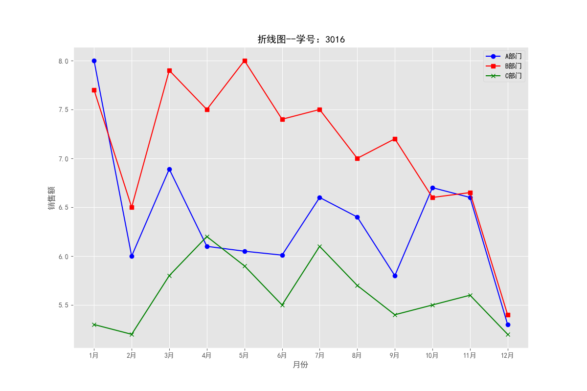 # -*- coding: utf-8 -*- """ Created on Sun Feb 26 22:01:54 2023 @author: 又双叒叕莹 """ import pandas as pd import matplotlib.pyplot as plt #导入绘图包 plt.rcParams['font.sans-serif'] = ['SimHei'] #解决中文显示问题 plt.rcParams['axes.unicode_minus'] = False # 解决中文显示问题 url = r"D:/a_learn/大三/a_大数据分析/实训1/data/dish_sale.xls" data = pd.read_excel(url) #画折线图对比数据 plt.figure(figsize=(12,8)) plt.plot(data['月份'],data['A部门'],color='blue',label='A部门',marker='o') plt.plot(data['月份'],data['B部门'],color='red',label='B部门',marker='s') plt.plot(data['月份'],data['C部门'],color='green',label='C部门',marker='x') plt.xlabel('月份') plt.ylabel('销售额') plt.title('折线图--学号:3016') #加标题 plt.legend() #显示图例 plt.show()