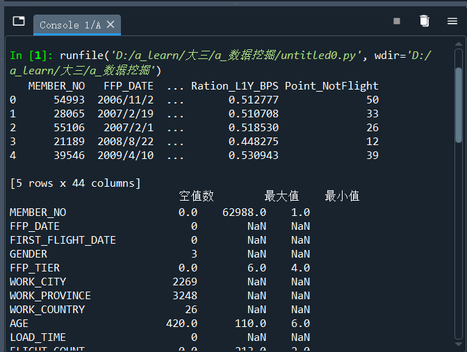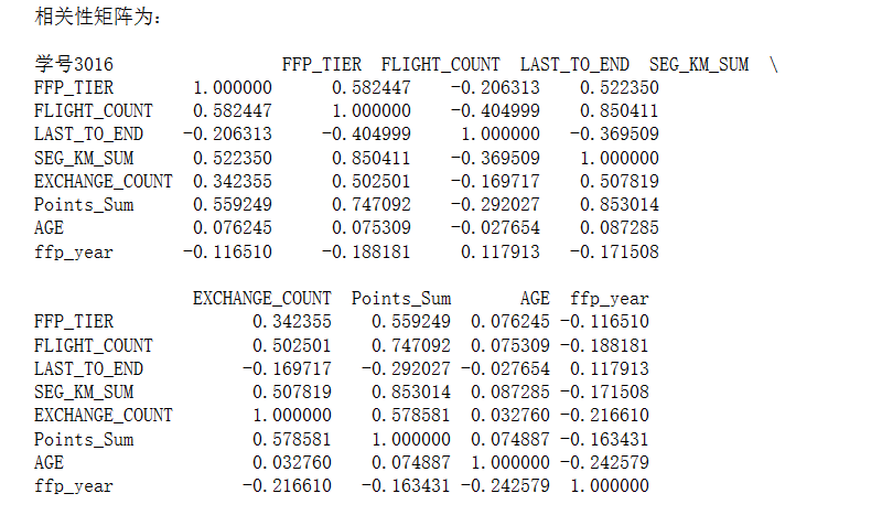 # -*- coding: utf-8 -*- """ Created on Sun Mar 12 22:17:04 2023 @author: 又双叒叕莹 """ import numpy as np import matplotlib.pyplot as plt from datetime import datetime import seaborn as sns from sklearn.preprocessing import StandardScaler from sklearn.cluster import KMeans import pandas as pd plt.rcParams['font.sans-serif'] = ['SimHei'] #用来正常显示中文标签 plt.rcParams['axes.unicode_minus'] = False #用来正常显示负号 #1.对数据进行基本的探索 #返回缺失值个数以及最大、最小值 datafile = r'D:/下载/微信备份/文件备份/WeChat Files/wxid_z7gj7w9vk2wl32/FileStorage/File/2023-03/air_data.csv' #读取原始数据,指定编码UTF-8 data = pd.read_csv(datafile, encoding='utf-8') print(data.head()) #包括对数据的基本描述,percentiles参数是指定计算多少的分为数表(如1/4分位数、中位数等) explore = data.describe(percentiles = [], include = 'all').T #describe()函数自动计算非空值数,需要手动计算空值数 explore['null'] = len(data) - explore['count'] explore = explore[['null', 'max', 'min']] explore.columns = [u'空值数', u'最大值', u'最小值'] #表头重命名 print(explore)