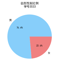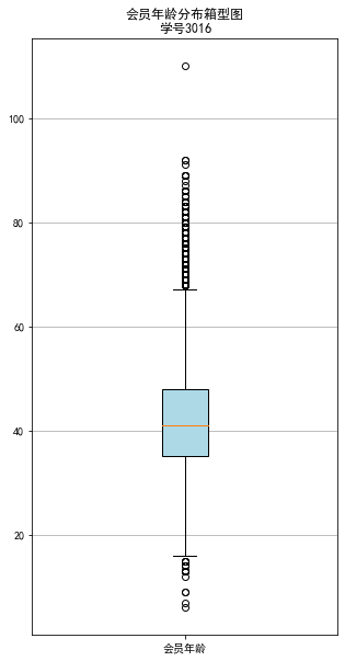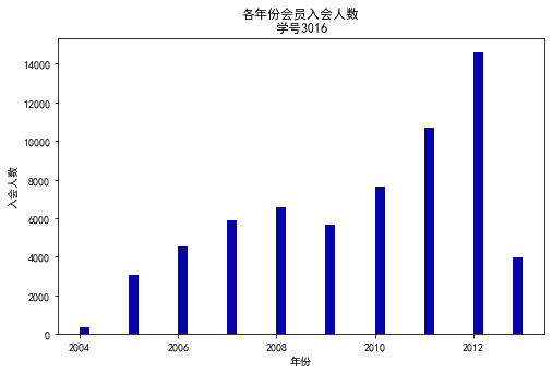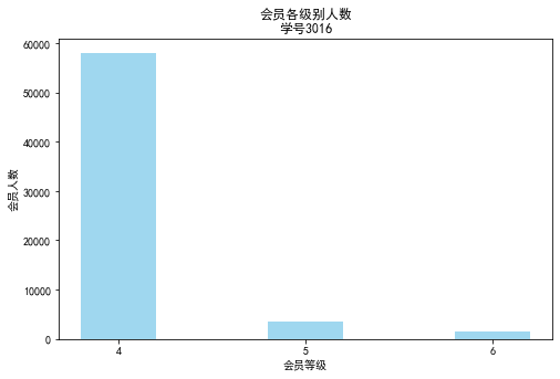 #客户信息类别 #提取会员入会年份 ffp = data['FFP_DATE'].apply(lambda x:datetime.strptime(x, '%Y/%m/%d')) ffp_year = ffp.map(lambda x : x.year) print(ffp_year) #绘制各年份会员入会人数直方图 fig = plt.figure(figsize=(8, 5)) #设置画布大小 plt.hist(ffp_year, bins='auto', color='#0504aa') plt.xlabel('年份') plt.ylabel('入会人数') plt.title('各年份会员入会人数\n学号3016') plt.show() plt.close() #提取会员不同性别人数 male = pd.value_counts(data['GENDER'])['男'] female = pd.value_counts(data['GENDER'])['女'] #绘制会员性别比例饼图 fig = plt.figure(figsize=(7, 4)) #设置画布大小 plt.pie([male, female], labels=['男', '女'], colors=['lightskyblue', 'lightcoral'], autopct='%1.1f%%') plt.title('会员性别比例\n学号3033') plt.show() plt.close() #提取不同级别会员的人数 lv_four = pd.value_counts(data['FFP_TIER'])[4] lv_five = pd.value_counts(data['FFP_TIER'])[5] lv_six = pd.value_counts(data['FFP_TIER'])[6] #绘制会员各级别人数条形图 fig = plt.figure(figsize=(8,5)) #设置画布大小 plt.bar(range(3), [lv_four, lv_five, lv_six], width=0.4, alpha=0.8, color='skyblue') #left:x轴的位置序列,一般采用arange函数产生一个序列; #height:y轴的数值序列,也就是柱形图的高度,一般就是我们需要展示的数据; #alpha:透明度 #width:为柱形图的宽度,一般这是为0.8即可; #color或facecolor:柱形图填充的颜色; plt.xticks([index for index in range(3)], ['4', '5', '6']) plt.xlabel('会员等级') plt.ylabel('会员人数') plt.title('会员各级别人数\n学号3016') plt.show() plt.close() #提取会员年龄 age = data['AGE'].dropna() age = age.astype('int64') #绘制会员年龄分布箱型图 fig = plt.figure(figsize=(5,10)) plt.boxplot(age, patch_artist=True, labels=['会员年龄'], boxprops={'facecolor': 'lightblue'}) #设置填充颜色 plt.title('会员年龄分布箱型图\n学号3016') #显示y坐标轴的底线 plt.grid(axis='y') plt.show() plt.close()