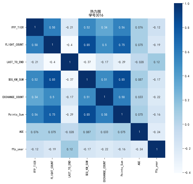 #3.相关性分析 #提取属性并合并为新的数据集 data_corr = data.loc[:,['FFP_TIER', 'FLIGHT_COUNT', 'LAST_TO_END', 'SEG_KM_SUM', 'EXCHANGE_COUNT', 'Points_Sum']] age1 = data['AGE'].fillna(0) data_corr['AGE'] = age1.astype('int64') data_corr['ffp_year'] = ffp_year #计算相关性矩阵 dt_corr = data_corr.corr(method='pearson') print('相关性矩阵为:\n\n学号3016', dt_corr) #绘制热力图 plt.subplots(figsize=(10, 10)) #设置画面大小 ## data:数据 square:是否是正方形 vmax:最大值 vmin:最小值 robust:排除极端值影响 sns.heatmap(dt_corr, annot=True, vmax=1, square=True, cmap='Blues') plt.title('热力图\n学号3016') plt.show() plt.close()