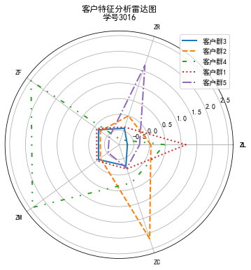 #4.数据预处理 print('原始数据的形状为:\n', data.shape) #去除票价为空的记录 data_notnull = data.loc[data['SUM_YR_1'].notnull() & data['SUM_YR_2'].notnull(), :] print('删除缺失记录后数据的形状为:\n', data_notnull.shape) #只保留票价非零的,或者平均折扣率不为0且总飞行公里数大于0的记录 index1 = data_notnull['SUM_YR_1'] != 0 index2 = data_notnull['SUM_YR_2'] != 0 index3 = (data_notnull['SEG_KM_SUM'] > 0) & (data_notnull['avg_discount'] != 0) index4 = data_notnull['AGE'] > 100 #去除年龄大于100的记录 data_clean = data_notnull[(index1 | index2) & index3 & ~index4] print('清洗后数据的形状为:\n', data_clean.shape) #属性选择 #选取需求属性 data_selection = data_clean[['FFP_DATE', 'LOAD_TIME', 'LAST_TO_END', 'FLIGHT_COUNT', 'SEG_KM_SUM', 'avg_discount']] print('筛选的属性前5行为:\n', data_selection) #构造属性L L = pd.to_datetime(data_selection['LOAD_TIME']) - pd.to_datetime(data_selection['FFP_DATE']) L = L.astype('str').str.split().str[0] L = L.astype('int')/30 #合并属性 data_features = pd.concat([L, data_selection.iloc[:,2:]], axis=1) print('构建的LRFMC属性前5行为:\n', data_features.head()) #数据标准化 data_standar = StandardScaler().fit_transform(data_features) print('标准化后LRFMC 5个属性为:\n', data_standar[:5,:]) #模型构建 k = 5 #确定聚类中心数 #构建模型,随机种子设为123 kmeans_model = KMeans(n_clusters=k, random_state=123) fit_kmeans = kmeans_model.fit(data_standar) #模型训练 #查看聚类结果 kmeans_cc = kmeans_model.cluster_centers_ #聚类中心 print('各类聚类中心为:\n', kmeans_cc) kmeans_labels = kmeans_model.labels_ #样本的类别标签 print('各样本的类别标签为:\n', kmeans_labels) r1 = pd.Series(kmeans_model.labels_).value_counts() #统计不同类别样本的数目 print('最终每个类别的数目为:\n', r1) #输出聚类分群的结果 cluster_center = pd.DataFrame(kmeans_model.cluster_centers_, columns=['ZL', 'ZR', 'ZF', 'ZM', 'ZC']) #将聚类中心放在数据框中 print(cluster_center) cluster_center.index = pd.DataFrame(kmeans_model.labels_).drop_duplicates().iloc[:,0] #将样本类别作为数据框索引 print(cluster_center) print(cluster_center.index) print(pd.DataFrame(kmeans_model.labels_).drop_duplicates().iloc[:,0]) #客户价值分析 #客户分群雷达图 labels = ['ZL', 'ZR', 'ZF', 'ZM', 'ZC'] legen = ['客户群' + str(i + 1) for i in cluster_center.index] lstype = ['-', '--', (0, (3, 5, 1, 5, 1, 5)), ':', '-.'] kinds = list(cluster_center.iloc[:,0]) #由于雷达图要保证数据闭合,因此要添加L列,并转换为np.ndarray cluster_center = pd.concat([cluster_center, cluster_center[['ZL']]], axis=1) centers = np.array(cluster_center.iloc[:, 0:]) #分割圆周长,并让其闭合 n = len(labels) angle = np.linspace(0, 2 * np.pi, n, endpoint=False) angle = np.concatenate((angle, [angle[0]])) labels=np.concatenate((labels,[labels[0]])) #绘图 fig = plt.figure(figsize=(8, 6)) ax = fig.add_subplot(111, polar=True) #以极坐标的形式绘制图形 #画线 for i in range(len(kinds)): ax.plot(angle, centers[i], linestyle=lstype[i], linewidth=2, label=kinds[i]) #添加属性标签 ax.set_thetagrids(angle * 180 / np.pi, labels) plt.title('客户特征分析雷达图\n学号3033') plt.legend(legen) plt.show() plt.close()