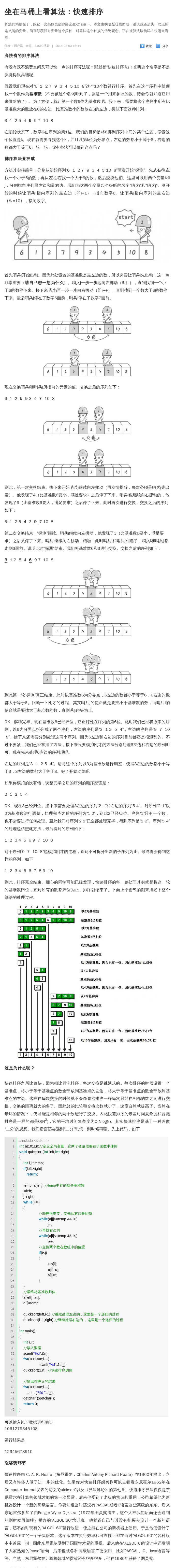 快速排序的思想是选一个基准数,然后找到这个基准数在数组里的位置,将大于它的放到它的右边,小于它的放到它的左边。