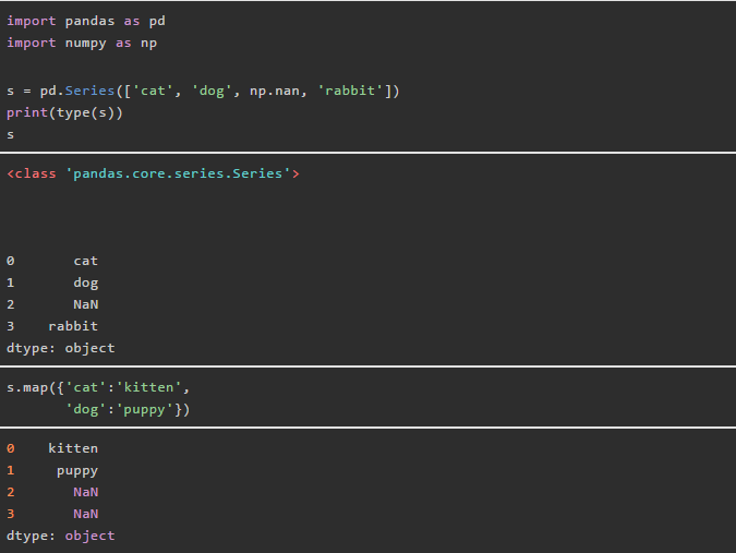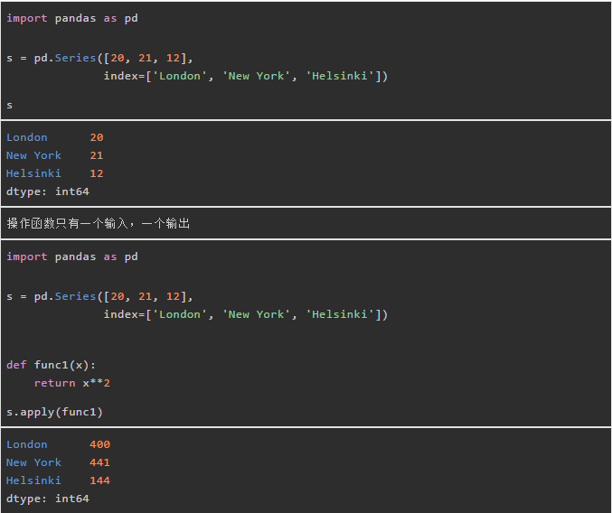 我们定义的操作函数,其输入和输出都是一个元素。这时候series.map和series.apply功效相同。