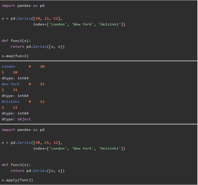 我们再看看操作函数输入一个,输出series(相当于多个元素)时,series的map和apply是否有区别