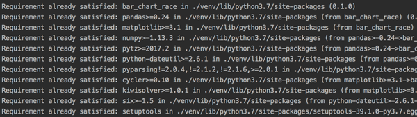 cd 你的项目地址/venv/lib/python3.7/site-packages/bar_chart_race-master python setup.py install # 成功安装的提示如下 # Finished processing dependencies for bar-chart-race==0.2.0