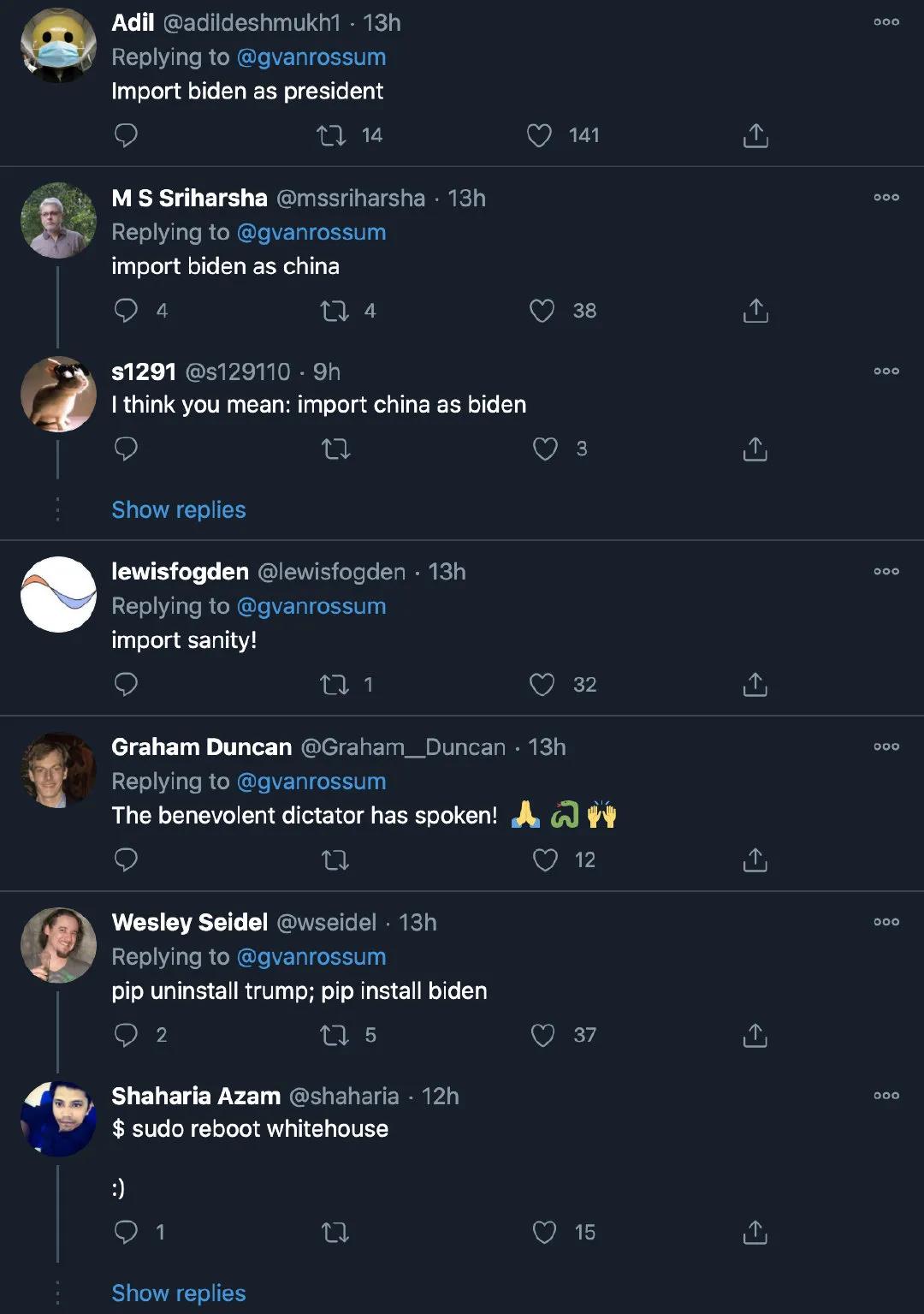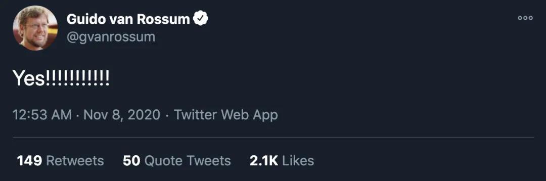 在美国的读者朋友和我说那边街上已经在敲锣打鼓了,而异国的网民朋友也有各种表达自己喜悦的方式。比如身在荷兰的Python的设计者Guido van Rossum就发了一条言简意赅的tweet: