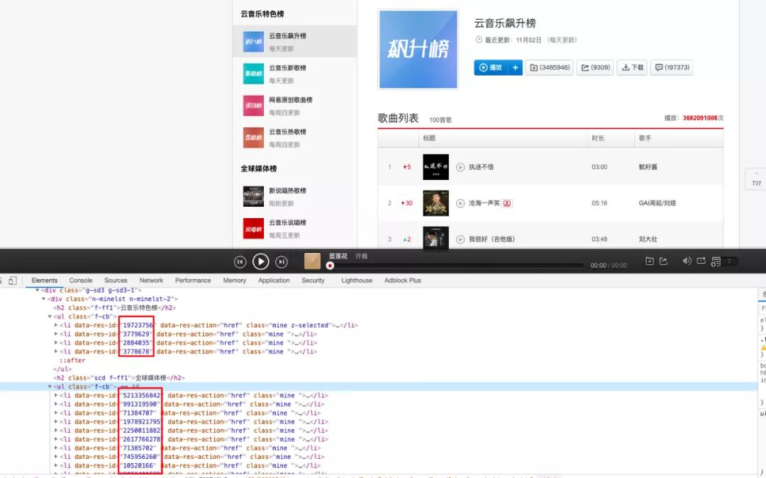 我们可以打开网易云排行榜 https://music.163.com/#/discover/toplist?id=19723756,仔细分析我们发现该网页左边一列全是排行榜,每个排行榜都对应这不同的排行榜 ID,具体 ID 是多少,直接调开开发者工具即可清晰的看到。