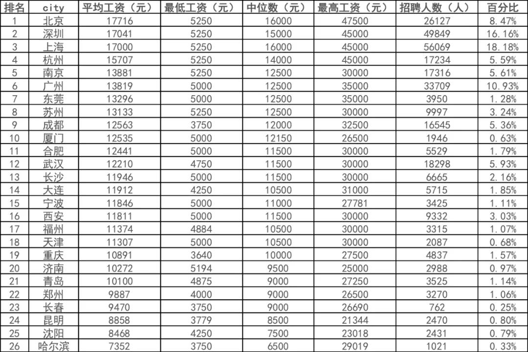 北京,上海,杭州,深圳,仍然是工资最高的四座城市。