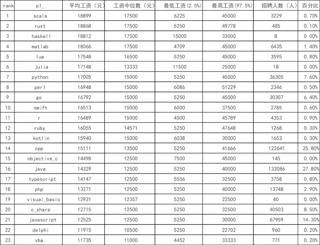 虽然 java 的市场占有率第一,然而工资最高的是 scala。